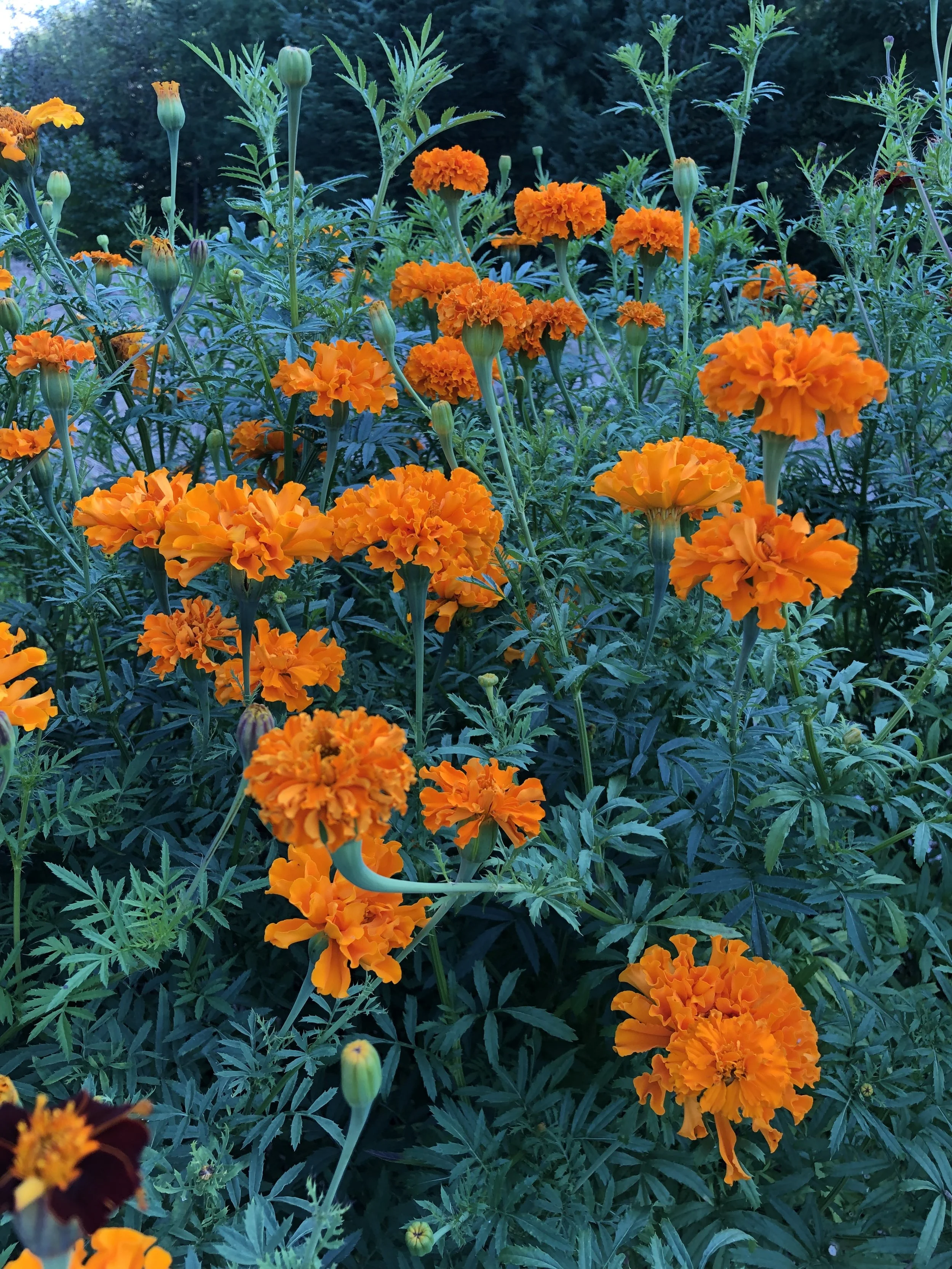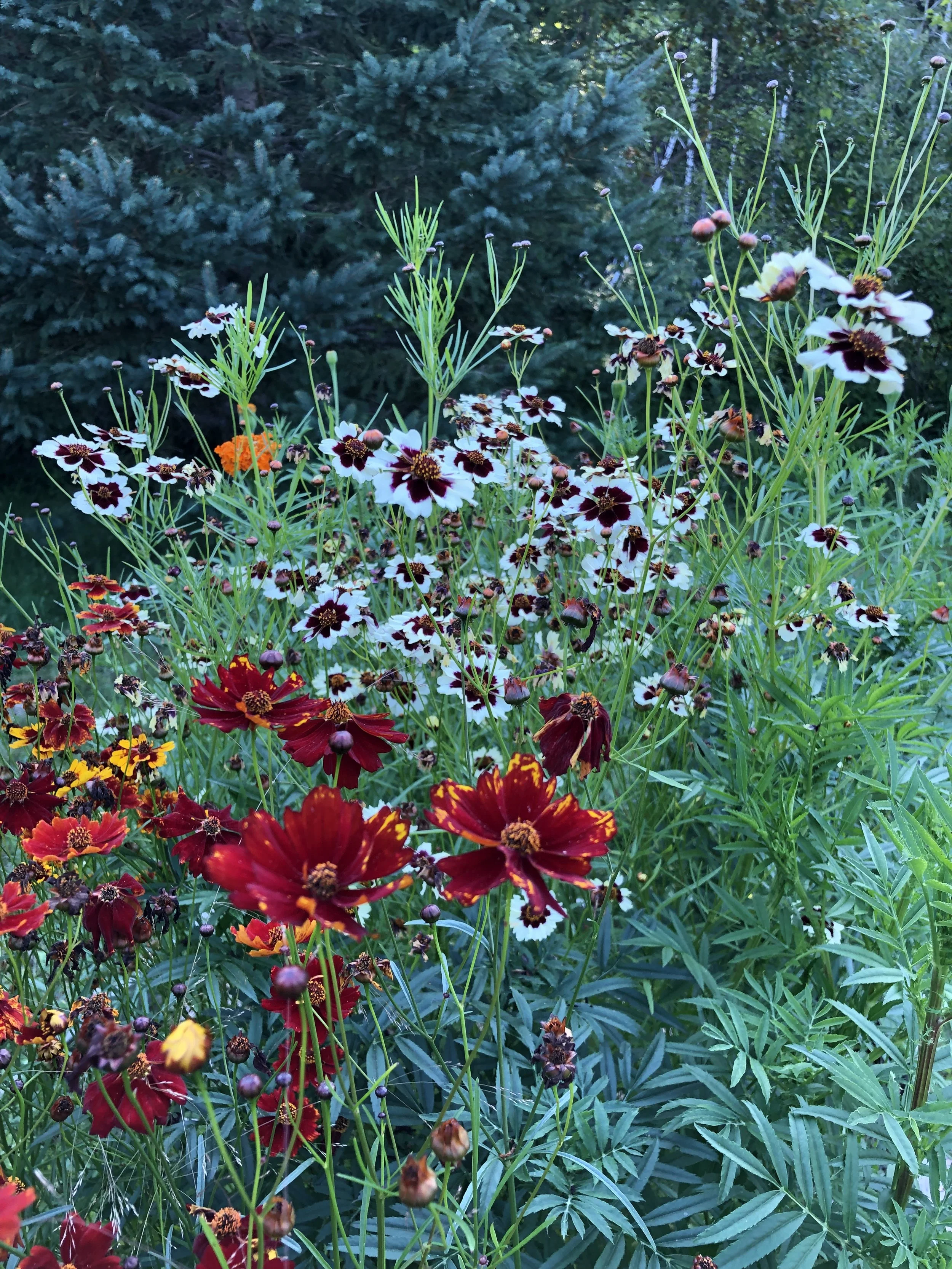 We grow natural dye plants that thrive in our soil and climate and offer a diverse range of divine colours. Some of the dye plants we grow are: coreopsis, cosmos, chamomile, marigold, black hollyhock, and black pincushion. We also harvest some of our dyes from trees and shrubs growing on the farmstead.