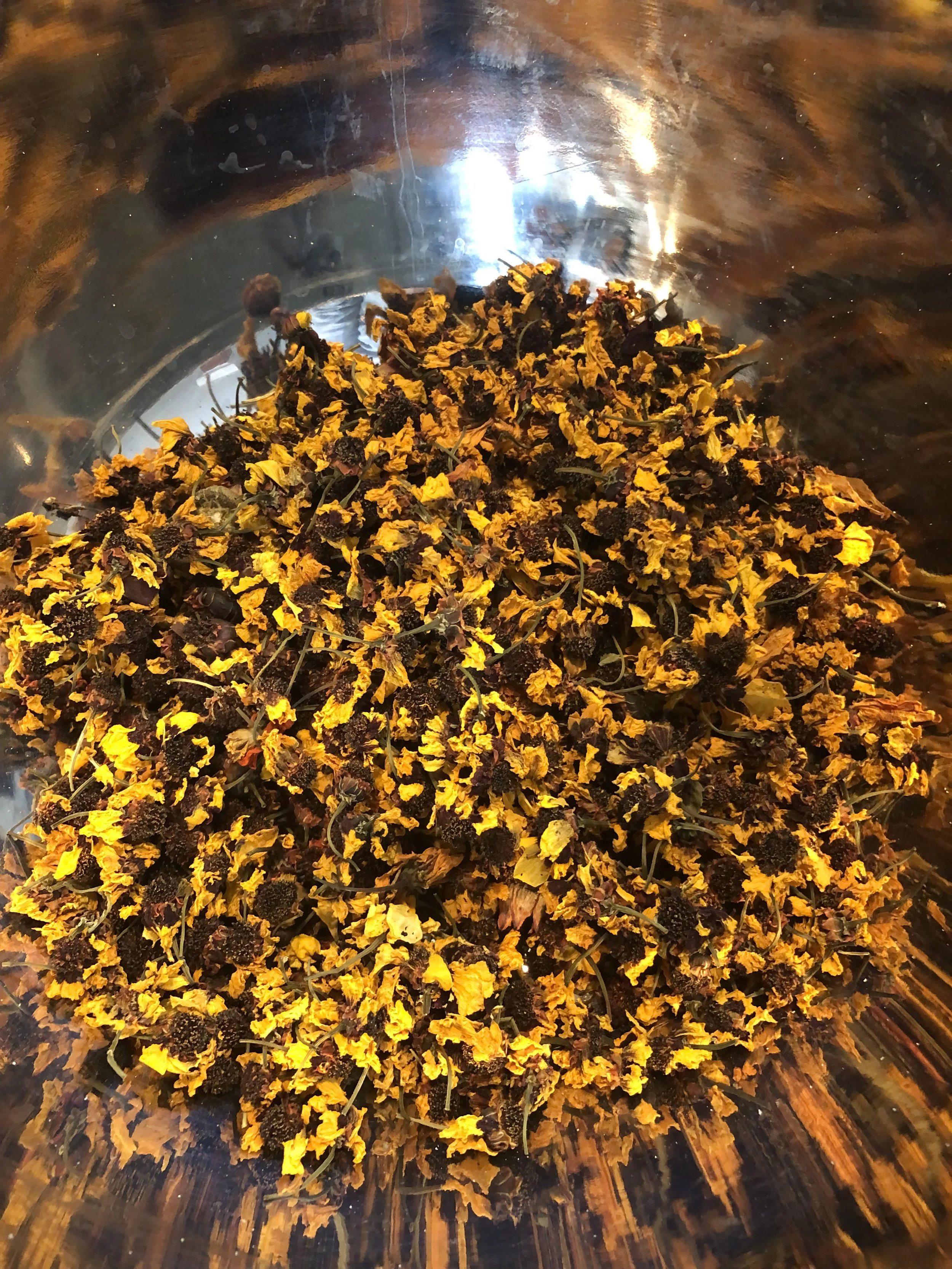 Dyer’s Coreopsis growing in the garden to dried to colour extraction in the dye pot