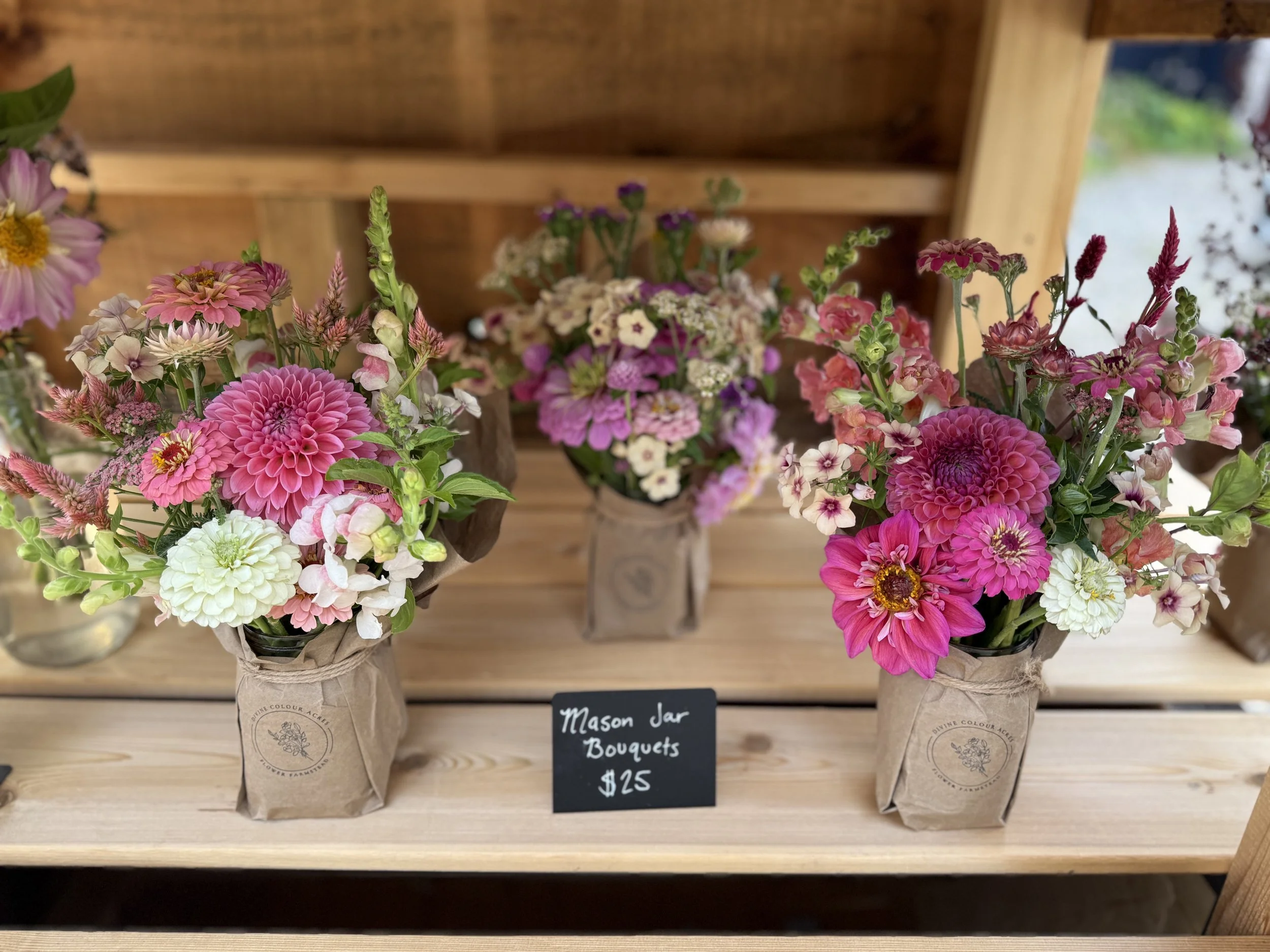 Our Mason Jar Arrangements are our most popular fresh flower arrangement. Available from mid-May to early October.